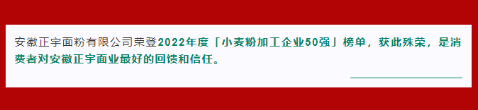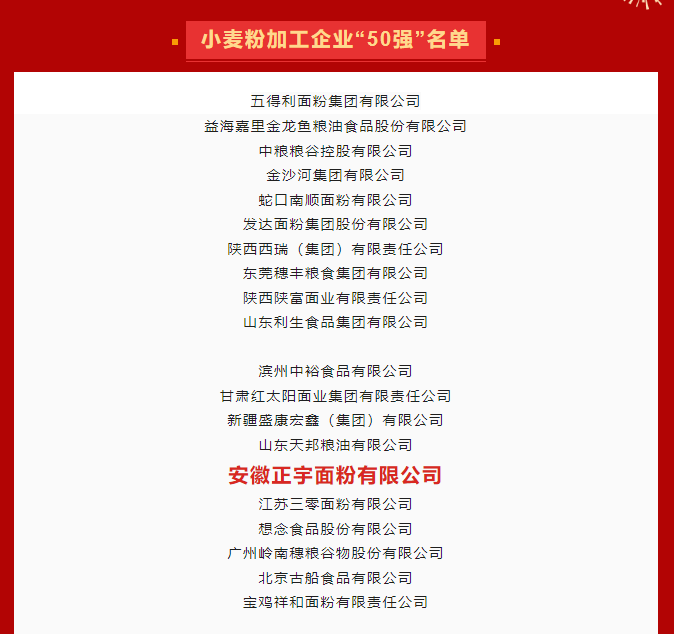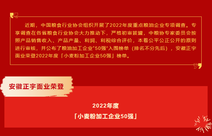 喜報!安徽正宇面業榮登2022年度「小麥粉加工企業50強」榜單