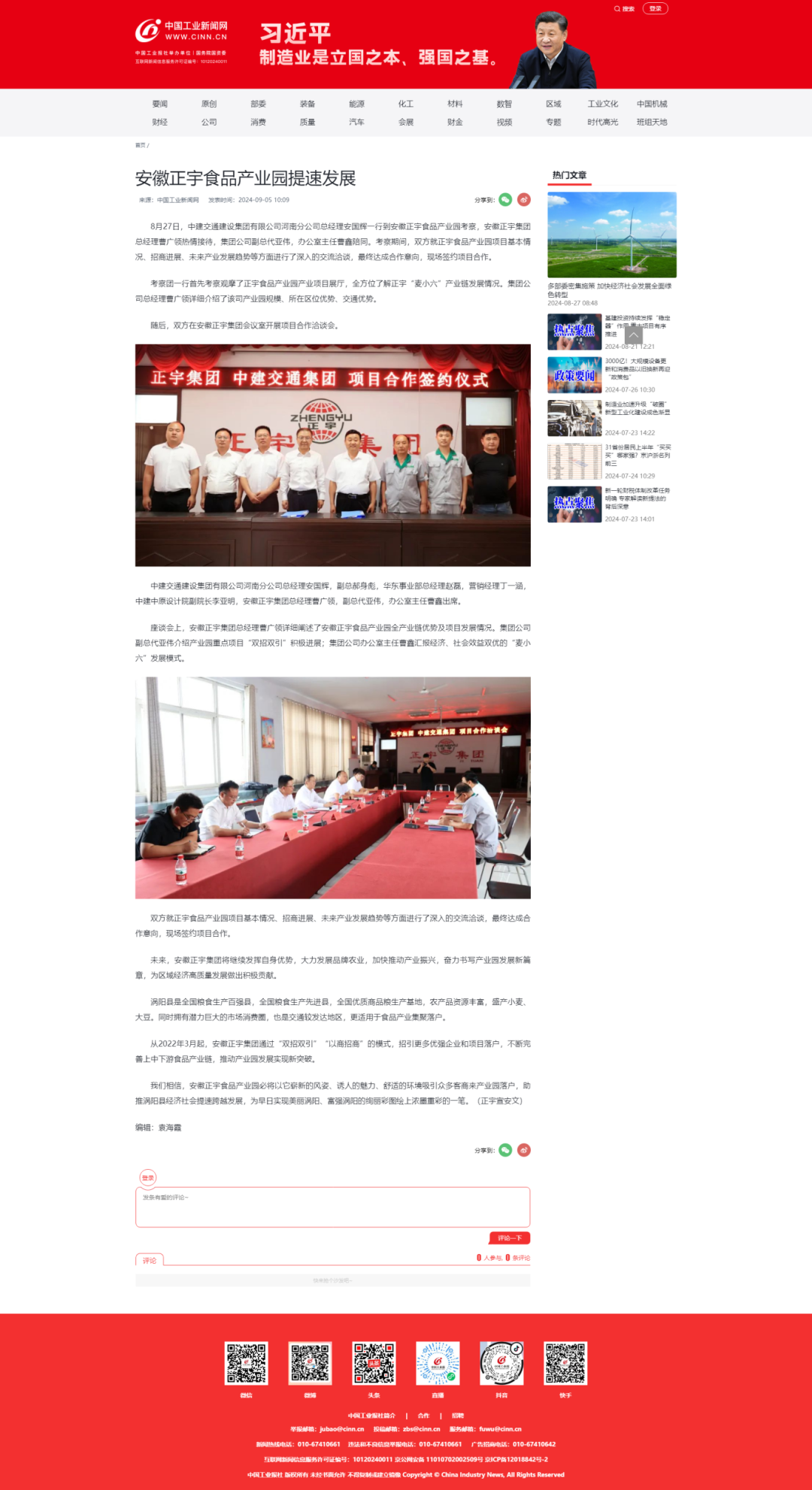 8月27日,中建交通建設集團有限公司河南分公司總經理安國輝一行到安徽正宇食品產業園考察并就正宇食品產業園項目基本情況、招商進展、未來產業發展趨勢等方面進行了深入的交流洽談,最終現場簽約項目合作。9月5日,中國工業報社下屬中國工業新聞網報道了這一消息。