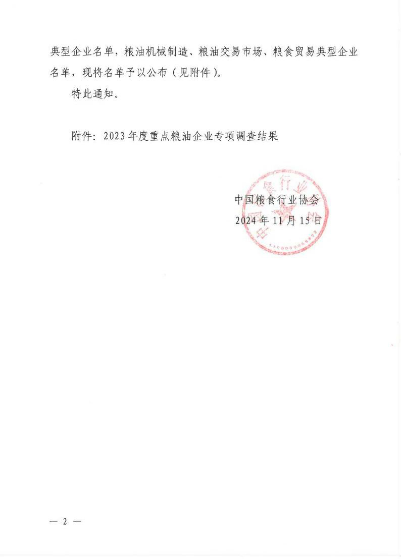 2024年11月15日,中國(guó)糧食行業(yè)協(xié)會(huì)下發(fā)《關(guān)于公布 2024年重點(diǎn)糧油企業(yè)專項(xiàng)調(diào)查結(jié)果的通知》。安徽正宇集團(tuán)旗下正宇面業(yè)榮獲“小麥粉加工典型企業(yè)”榮譽(yù)稱號(hào)